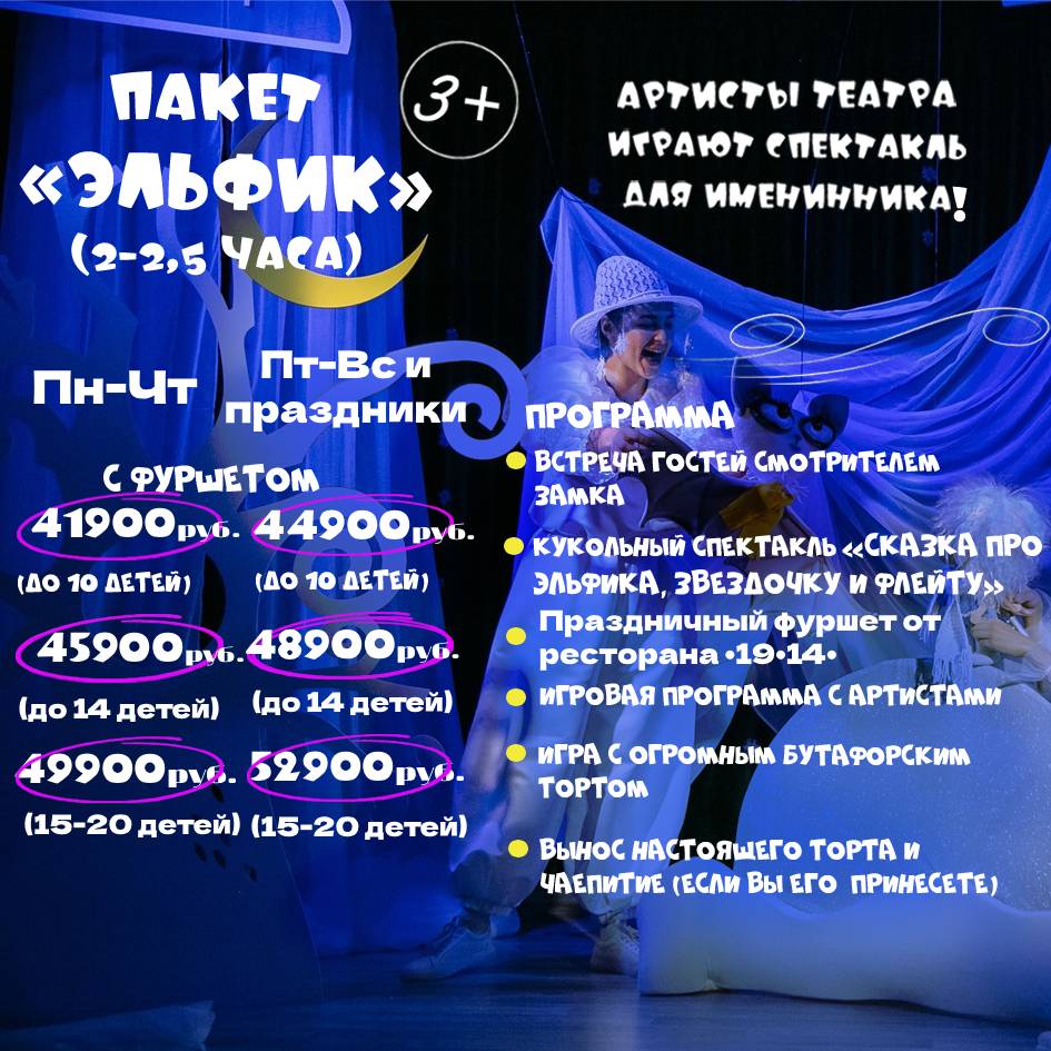 - Индивидуальный показ кукольного спектакля “Сказка про Эльфика, Звездочку и флейту” труппой театра