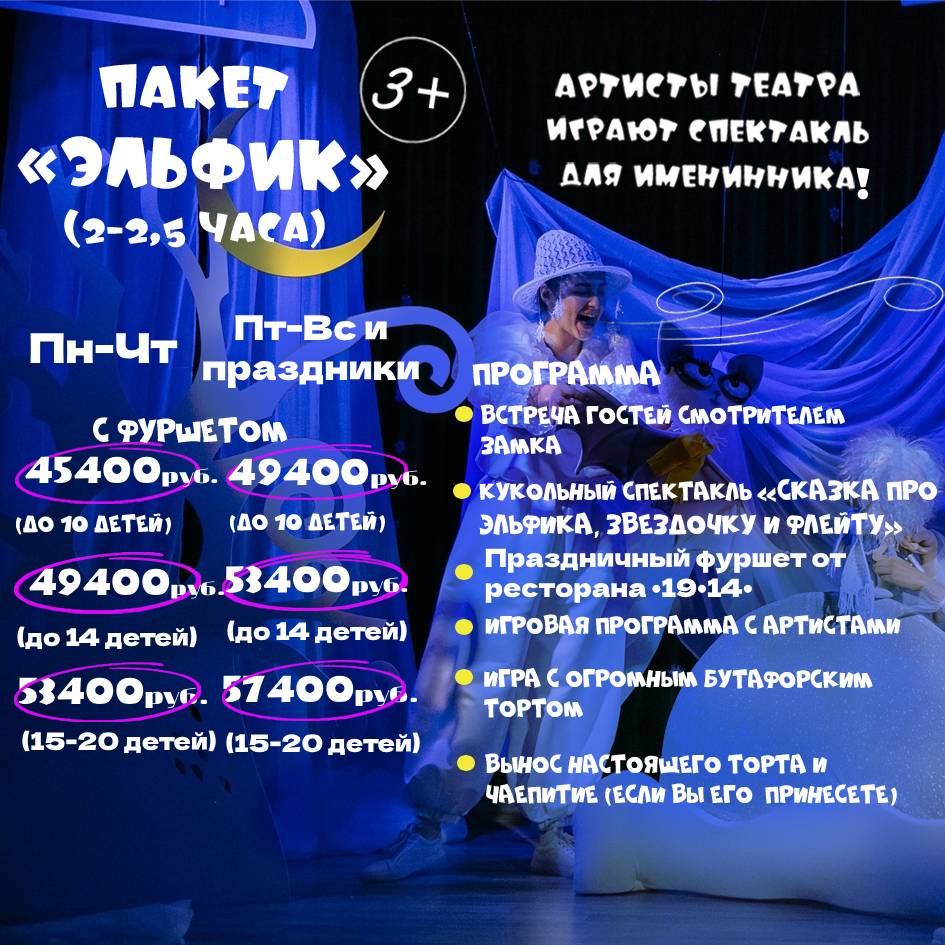 - Индивидуальный показ кукольного спектакля “Сказка про Эльфика, Звездочку и флейту” труппой театра