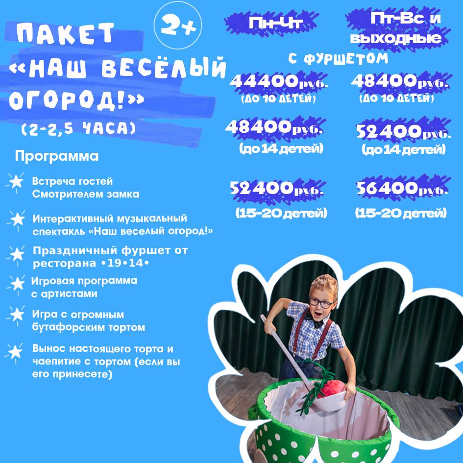 - Индивидуальный показ интерактивного музыкального спектакля “Наш веселый огород” труппой театра