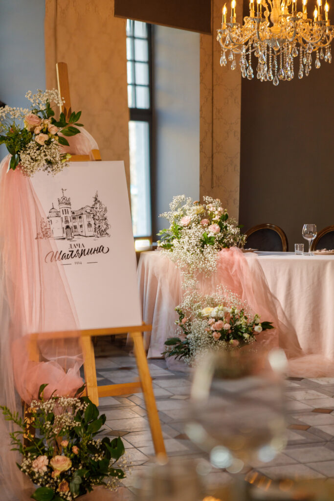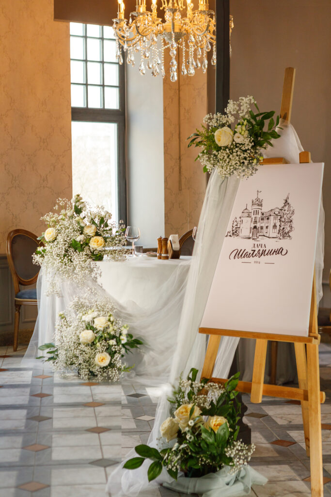 - постер на мольберте с рассадкой гостей, цветы, драпировка