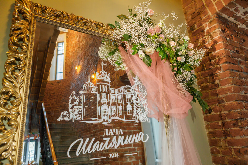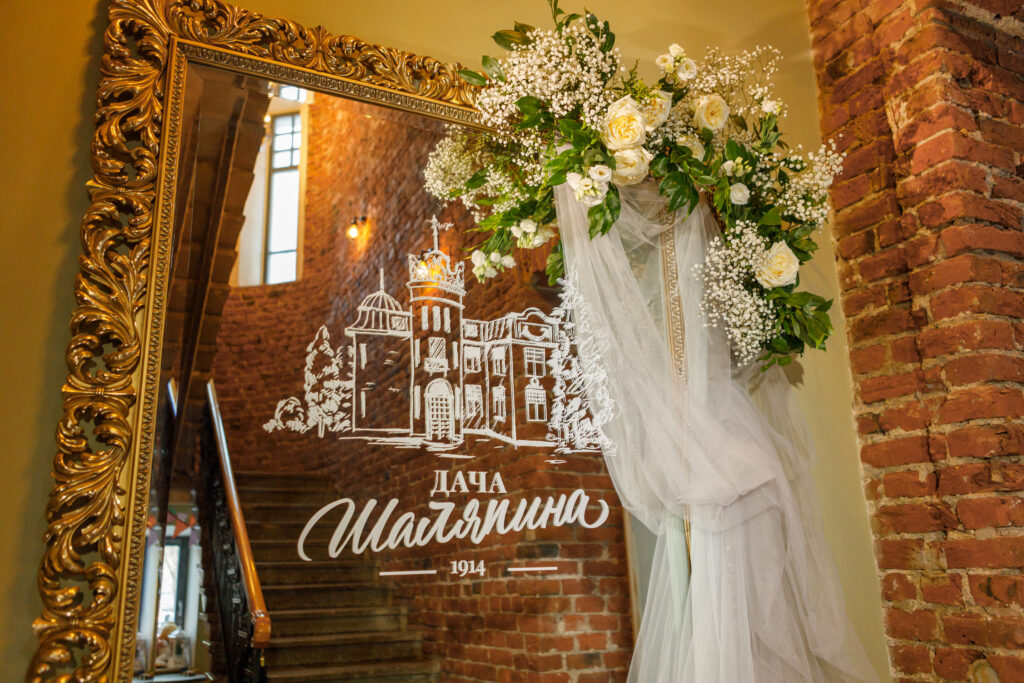 - украшение зеркала у парадной лестницы именами жениха и невесты, цветы, драпировка